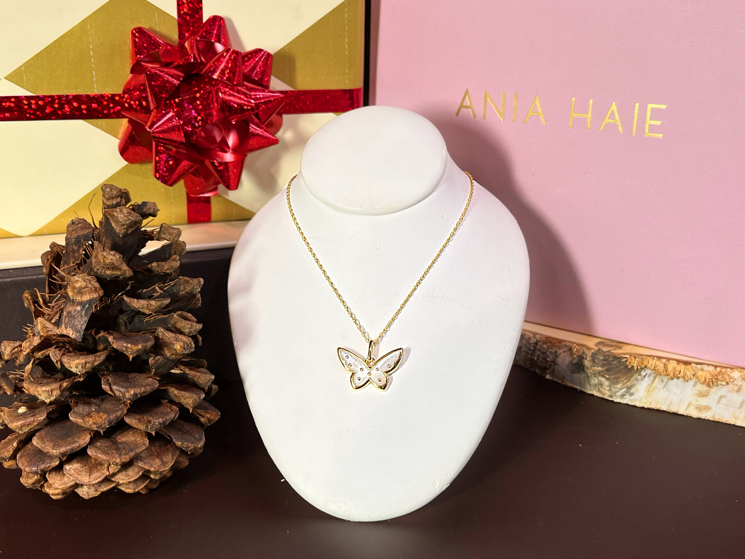 Day Eleven, 12/18: A stunning Vermeil Sterling Silver Butterfly Pendant featuring a delicate mother-of-pearl inlay from designer Ania Haie. This pendant comes on a 14k gold-filled 20 inch long rope chain; a design that radiates grace and timeless beauty. Perfect for layering or wearing solo, this necklace transforms any outfit into a statement of refined elegance. Sold in store for $134