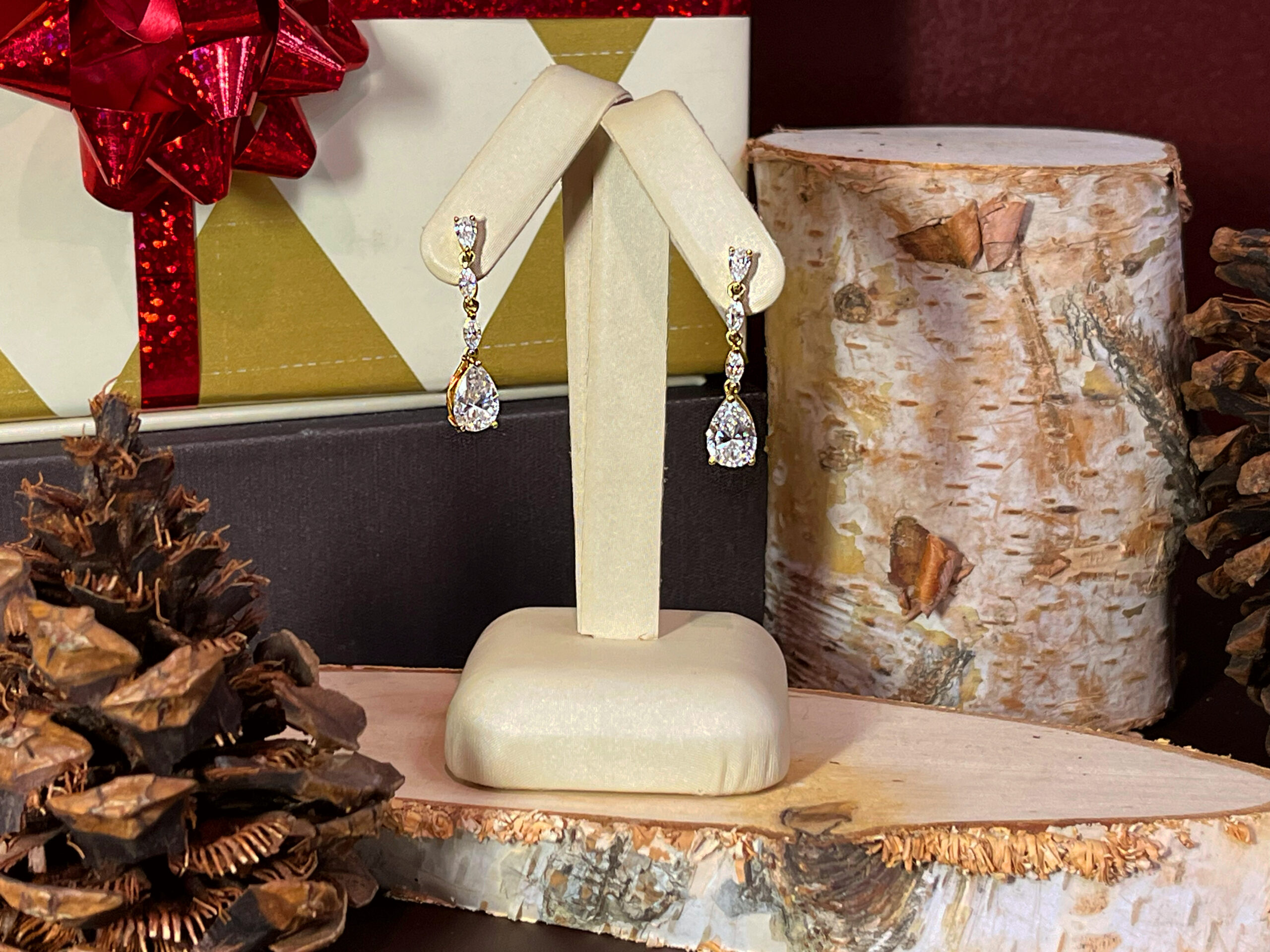 Day Eight, 12/15: Beautiful pair of Vermeil sterling silver dangle earrings, featuring dazzling pear and marquise cut cubic zirconia that is sure to turn heads! The warm golden Vermeil finish adds a rich, timeless glow; a statement piece made for celebrations, soirées, and unforgettable moments. Sold in store for $69
